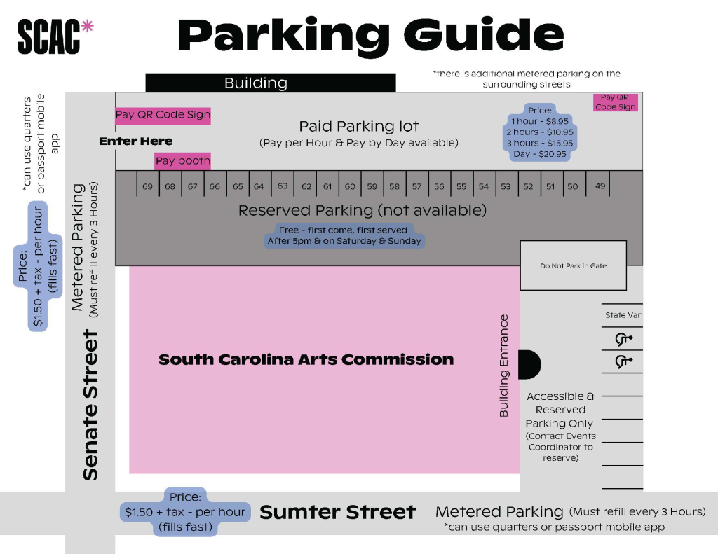 Guest parking is not available in the SCAC lot. Event attendees must find alternative parking spaces on nearby streets, parking garages or parking lots. Meters are overseen by the City of Columbia and garages/lots are privately owned. If you are in need of accessible parking or have mobility issues, please notify us at least 48 hours prior so accommodations can be made.