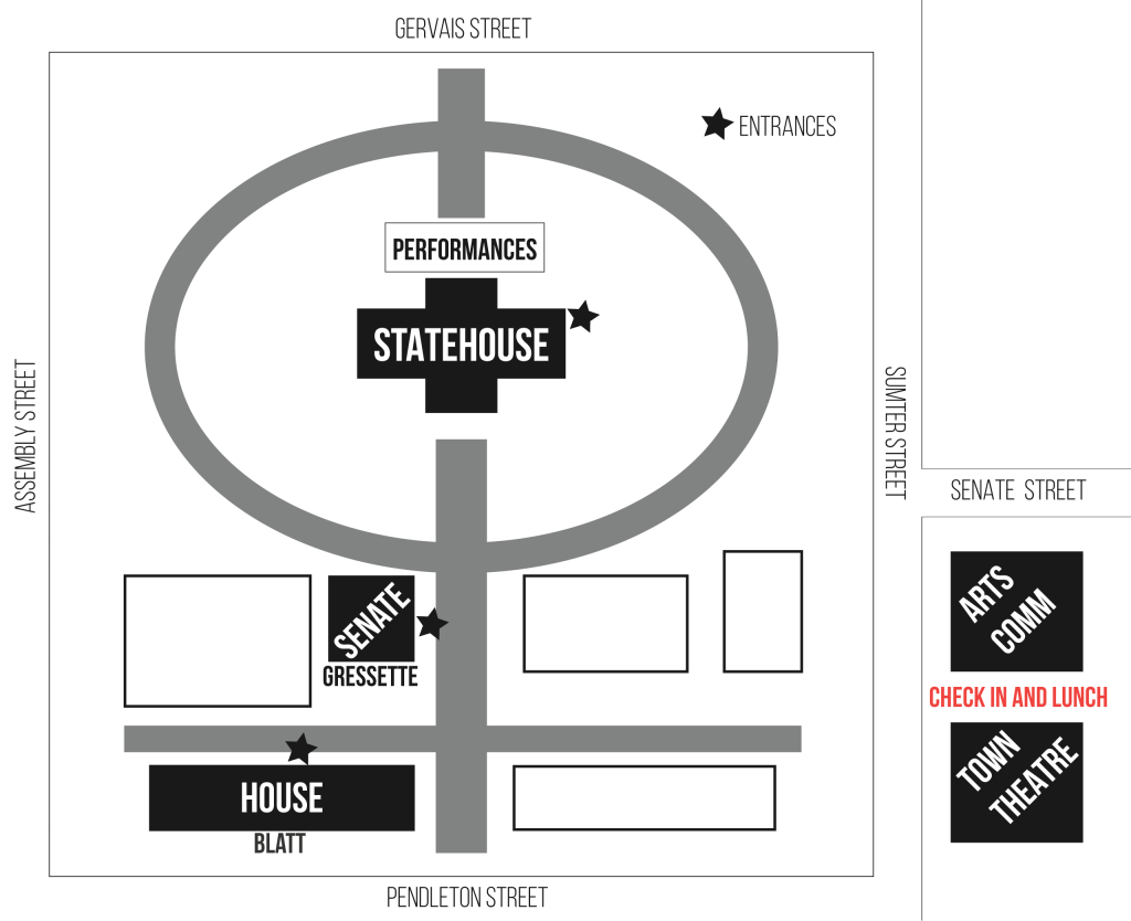 Legislative meetings will take place across the street on the State House grounds and legislative offices. The Arts Commission offices will remain open as a “staging” area in between meetings and other State House events.